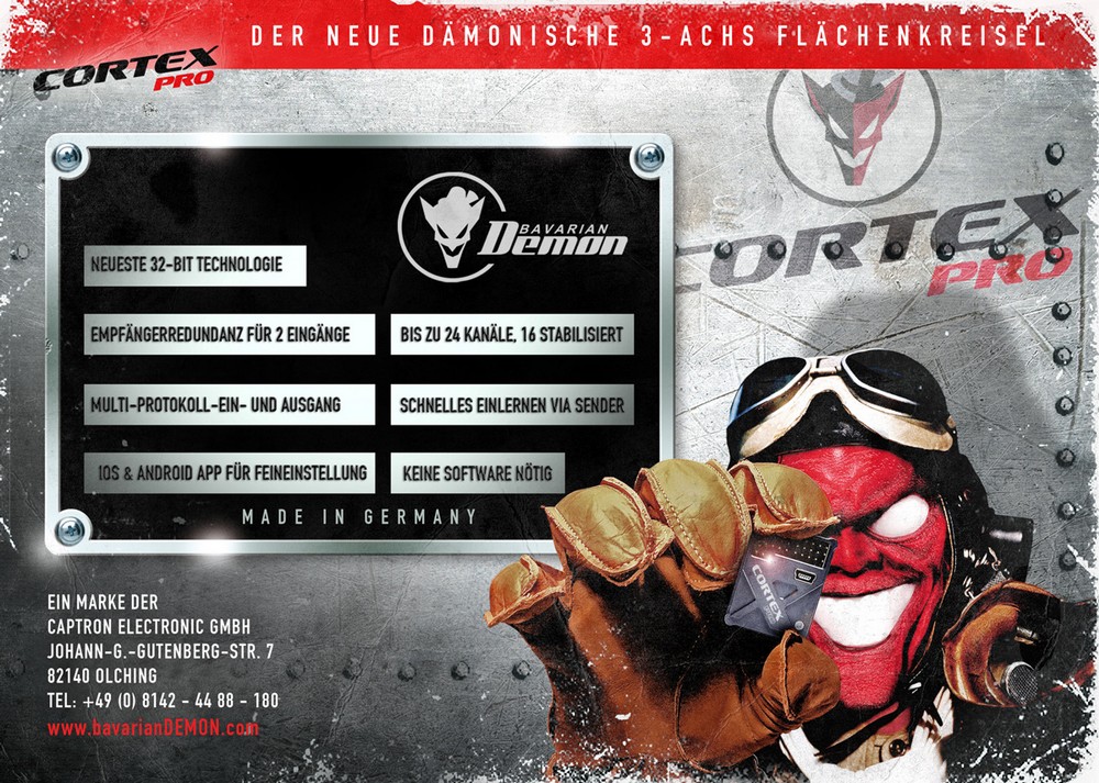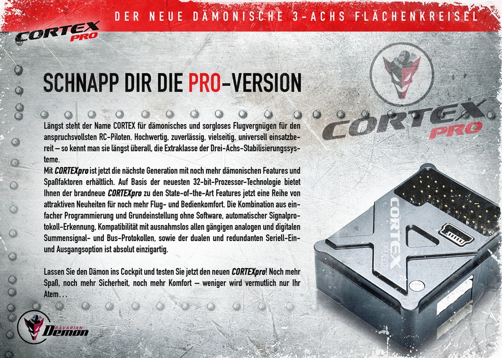 Mit CORTEXpro ist jetzt die nächste Generation mit noch mehr dämonischen Features und Spaßfaktoren erhältlich. Auf Basis der neuesten 32-bit-Prozessor-Technologie bietet Ihnen der brandneue CORTEXpro zu den State-of-the-Art Features jetzt eine Reihe von attraktiven Neuheiten für noch mehr Flug- und Bedienkomfort. Die Kombination aus einfacher Programmierung und Grundeinstellung ohne Software, automatischer Signalprotokoll-Erkennung, Kompatibilität mit ausnahmslos allen gängigen analogen und digitalen Summensignal- und Bus-Protokollen, sowie der dualen und redundanten Seriell-Ein- und Ausgangsoption ist absolut einzigartig.