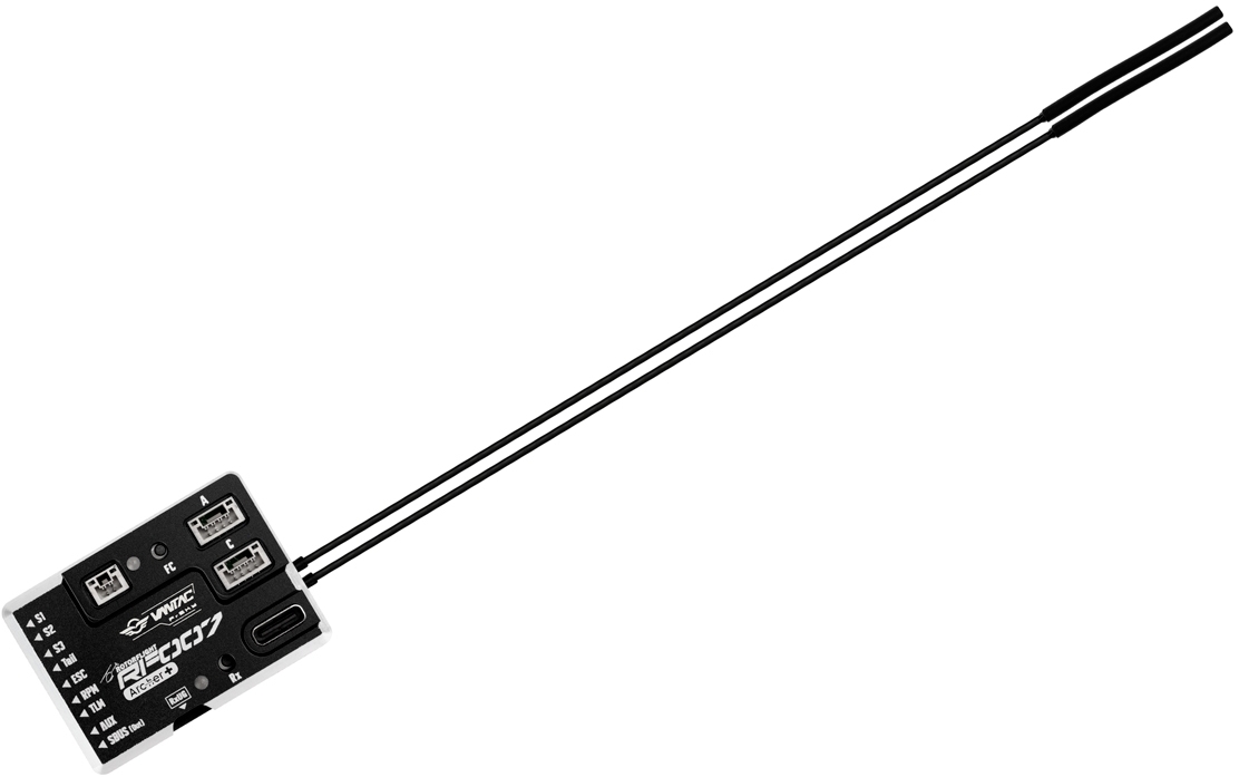 Die RF007 ist mit einem eingebauten Empfänger FrSky Access 2,4 GHz RS ausgestattet, der direkt mit KAVAN oder FrSky Sendern verbunden werden kann, wodurch ein externer Empfänger nicht gebraucht wird. Der interne Empfänger ist über einen UART-Bus angeschlossen, der über das FBUS-Protokoll kommuniziert. Für Benutzer mit anderen Anforderungen kann der Empfänger auch über das Hauptpanel oder einen der Erweiterungsports angeschlossen werden. Rotorflight unterstützt eine breite Palette von Protokollen zur Übertragung des Empfängersignals. Eine vollständige Liste der unterstützten Protokolle finden Sie im Tool Rotorflight Configurator oder unter https://rotorflight.org.