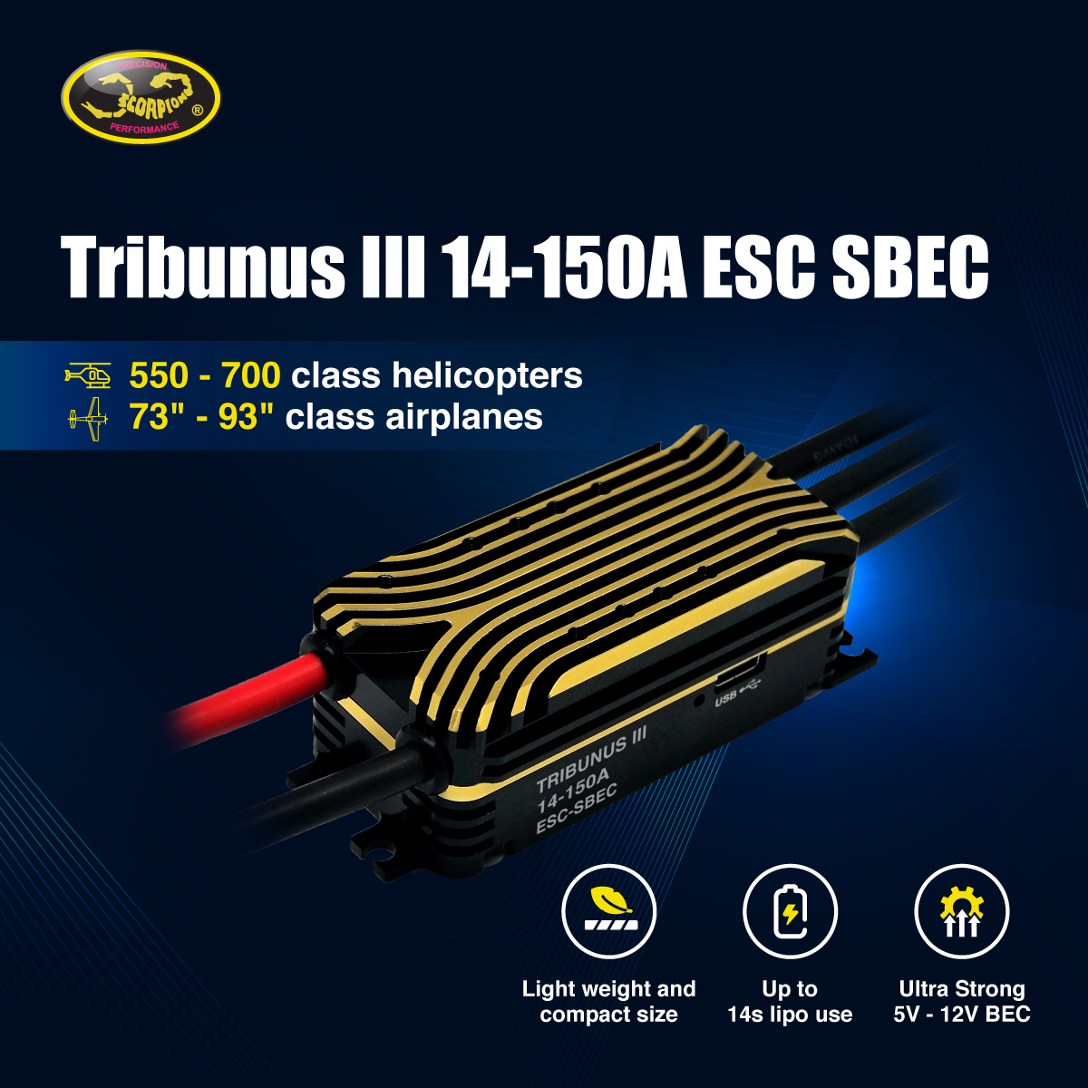 Der Tribunus III 14-150A ESC SBEC - eine neue Ära elektronischer Drehzahlregler von Scorpion Power Systems.