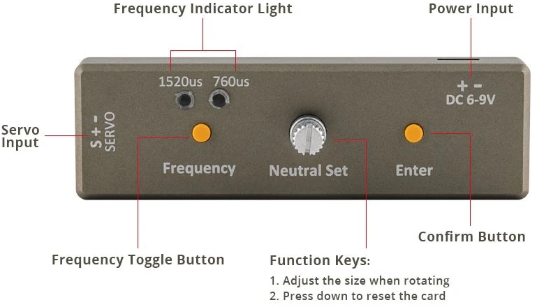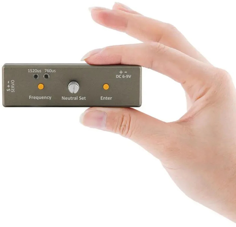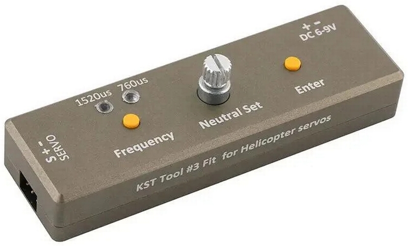 A programming device for KST V6.0 and V8.0 servos, it is a very useful tool that makes it possible to not only change the frequency of the servo but also to set the neutral position which likewise adjusts the full travel. This gives the ultimate perfect centering of the servo, a handy tool!